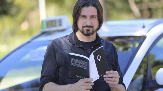 Pasado el mediodía llega Jesús Báez (Málaga, 1978) a la plaza de la Merced en su taxi. Apaga el taxímetro y saca un ejemplar de Flautista en el camino (editorial Anáfora). Pide una mesa a la sombra, “soy un noctámbulo y no me llevo bien con el sol” y comienza a liar un cigarrillo. Viste por completo de negro, gafas de sol y coleta a juego. Roza el metro noventa y rompe con el tópico del taxista con sillón de bolas y El Fari en la radio. Sus altavoces rugen rock.